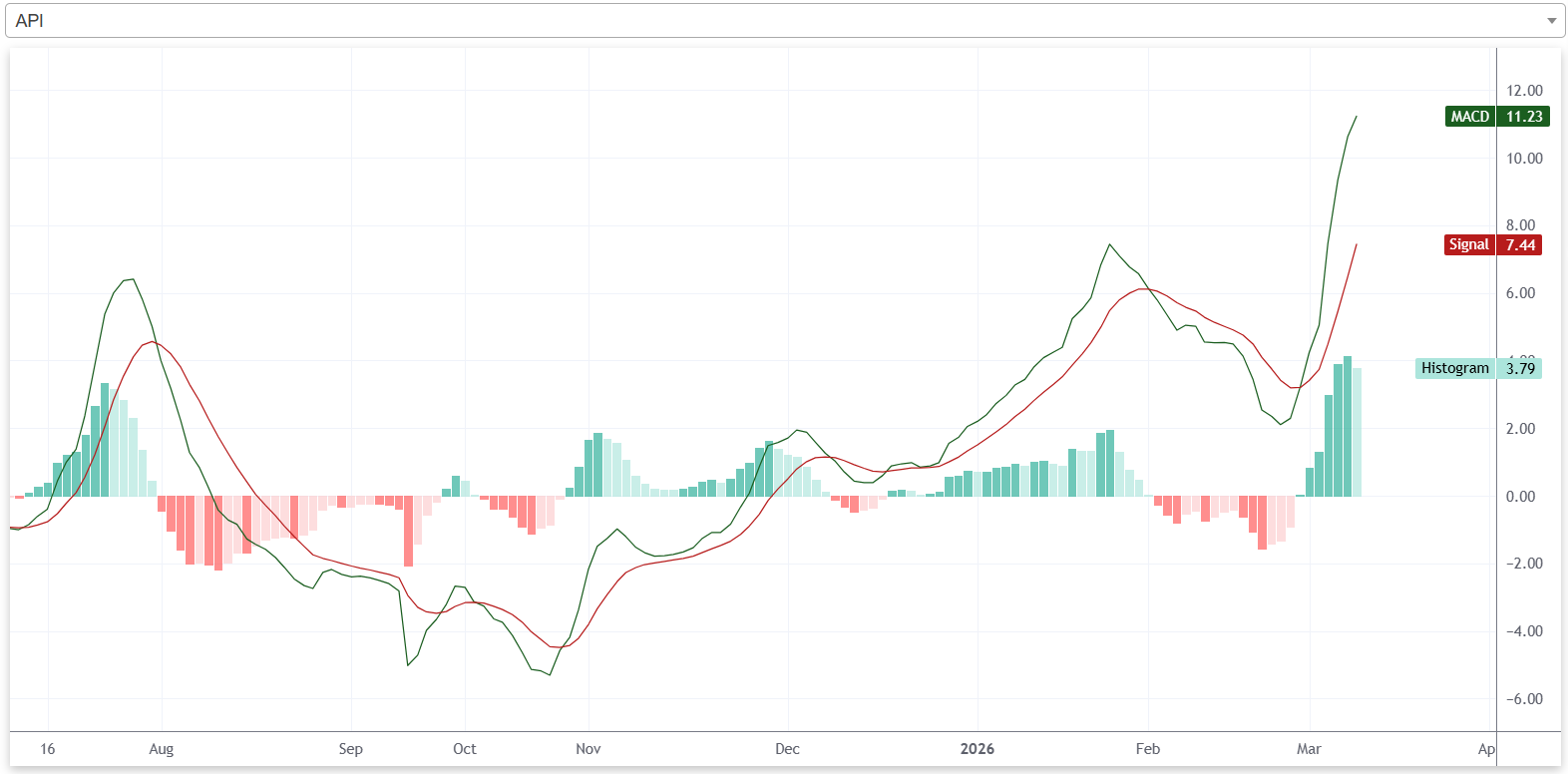 यस साता कम्पनीको एमएसिडी रेखा र सिग्नल रेखा बीचको दूरी फराकिलो रहेको छ। त्यस्तै, कम्पनीको हिस्टोग्राम पनि सकारात्मक क्षेत्रमा रहेको छ। यसले यस साता कम्पनीको शेयरमूल्य बुलिश प्रवृत्तिमा रहेको संकेत गर्दछ। यद्यपि, साताको अन्तिम कारोबार दिन कम्पनीको हिस्टोग्रामको उचाई केही घटेको छ। त्यस्तै, कम्पनीको एमएसिडी रेखा धेरै माथि पुगेको छ। यसले आगामी दिनमा कम्पनीको शेयरमूल्यमा केही ‘करेक्सन’ आउन सक्ने संकेत गर्दछ।