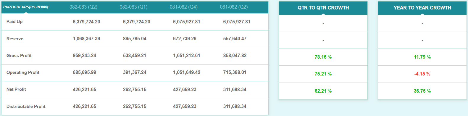चालु आर्थिक वर्षको पुस मसान्तसम्ममा कम्पनीले ४२ करोड ६२ लाख रुपैयाँ खुद नाफा आर्जन गरेको छ। यो गत आर्थिक वर्षको सोही अवधिको तुलनामा ३६.७५ प्रतिशत बढी हो। गत आर्थिक वर्षको सोही अवधिसम्ममा कम्पनीले ३१ करोड १६ लाख रुपैयाँ खुद नाफा कमाएको थियो।