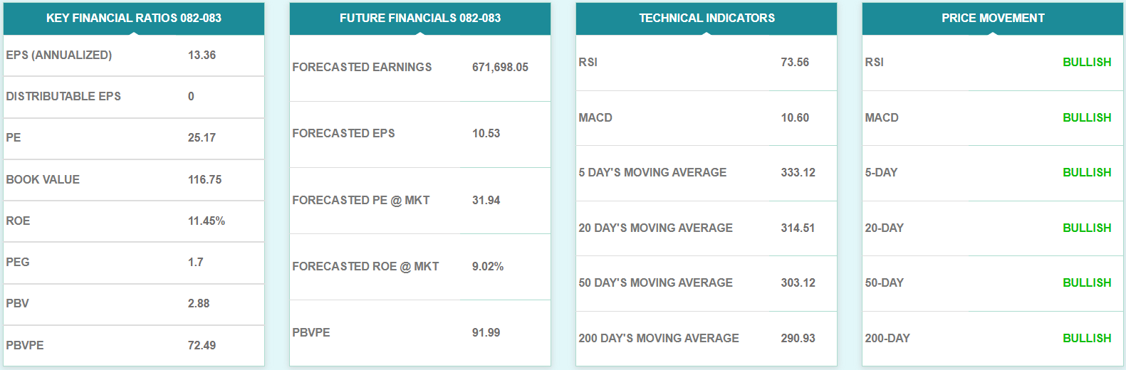 कम्पनीको पछिल्लो ५२ हप्ताको उच्च मूल्य ३३५ रुपैयाँ रहेको छ भने न्यून मूल्य २५८ रुपैयाँ ८० पैसा रहेको छ। कम्पनीको १८० दिने औषत मूल्य २९० रुपैयाँ ९९ पैसा रहेको छ।
