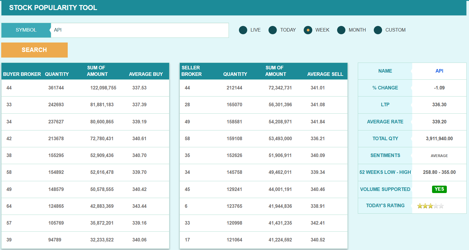यस साता ब्रोकर नम्बर ४४ ले कम्पनीको सबैभन्दा बढी शेयर खरिदबिक्री गरेको छ। सो ब्रोकरले यस साता कम्पनीको ३ लाख ६१ हजार ७४४ कित्ता शेयर खरिद गरी २ लाख १२ हजार १४४ कित्ता शेयर बिक्री गरेको छ। त्यसैगरी, यस साता ब्रोकर नम्बर ३३ ले कम्पनीको २ लाख ४२ हजार ६९३ कित्ता शेयर खरिद गरेको छ भने ३४ ले २ लाख ३७ हजार ६२७ कित्ता शेयर खरिद गरेको छ।