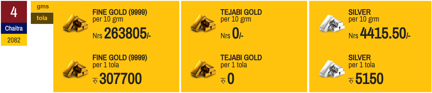 नेपाल सुनचाँदी व्यवसायी महासंघका अनुसार आज छापावाल सुन प्रतितोला ३ लाख ७ हजार ७०० रुपैयाँमा कारोबार भइरहेको छ । मंगलबारको बजारमा सुन प्रतितोला ३ लाख ९ हजार ९ सय रुपैयाँमा रुपैयाँमा कारोबार भएको थियो ।