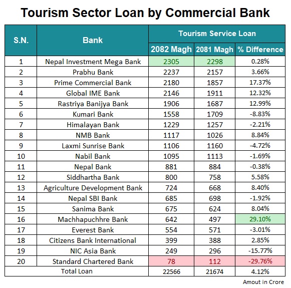 पर्यटन क्षेत्रमा सबैभन्दा बढी विश्वास र लगानी गर्नेमा नेपाल इन्भेष्टमेन्ट मेगा बैंक देखिएको छ। यस बैंकले २०८२ माघसम्म कुल २३ अर्ब ५ करोड रुपैयाँ कर्जा प्रवाह गरेको छ। यद्यपि, यसको वृद्धिदर भने अघिल्लो वर्षको तुलनामा मात्र ०.२८ प्रतिशतले बढेको छ।