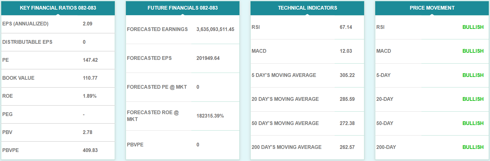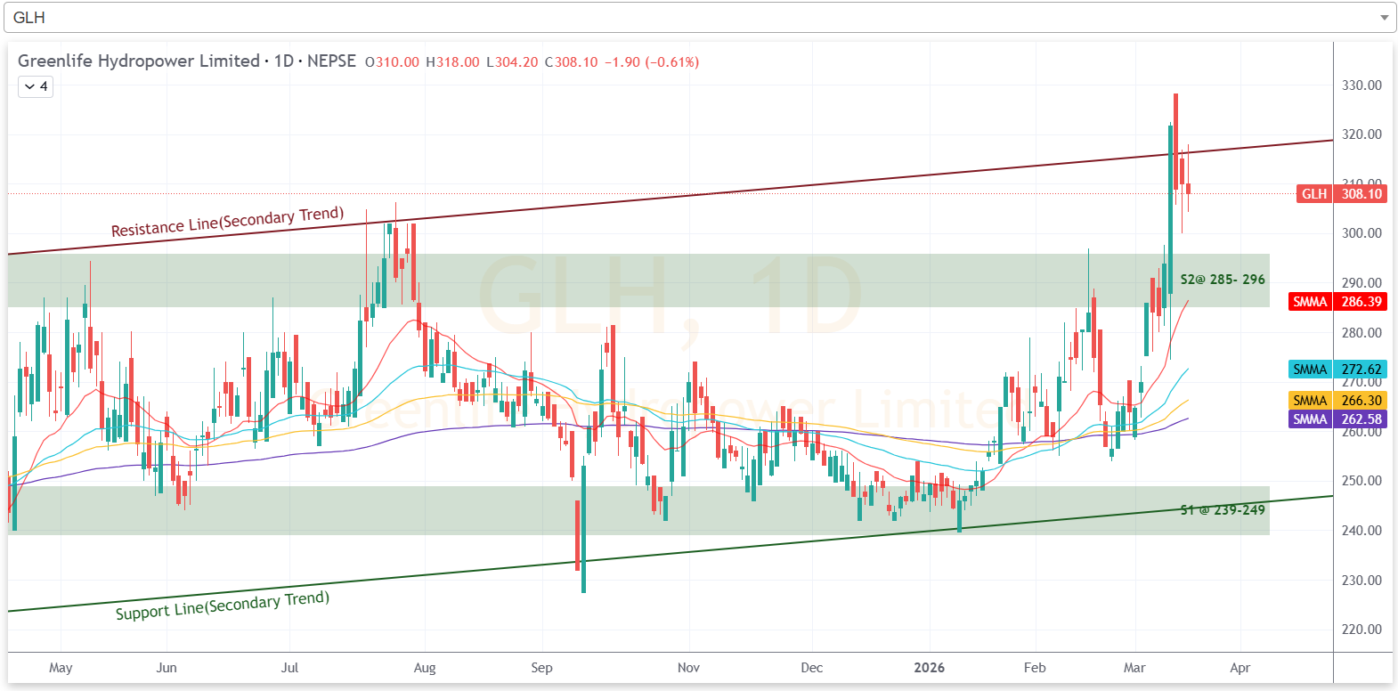 यस साता कम्पनीको शेयरमूल्यले २८५ देखि २९६ को प्रतिरोध क्षेत्र तोडेर उक्लिएको छ। लामो समयदेखि २४० देखि २९५ को क्षेत्रमा कारोबार भइरहेको कम्पनीको शेयरमूल्यले यस साताको पहिलो कारोबार दिन ‘ब्रेकआउट’ गरेको हो। सोपश्चात भने कम्पनीको शेयरमूल्य घट्दो क्रममा रहेको छ। यसले लगानीकर्ताहरुले ‘प्रोफिट बुक’ गरेको संकेत गर्दछ।