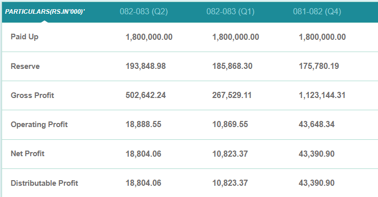 चालु आर्थिक वर्षको पहिलो ६ महिनासम्ममा कम्पनी १ करोड ८८ लाख ४ हजार रुपैयाँ खुद नाफा कमाएको छ। गत आर्थिक वर्षको सोही अवधिसम्ममा कम्पनीको यस्तो मुनाफा १ करोड ५० लाख ७४ हजार रुपैयाँ रहेको थियो।
