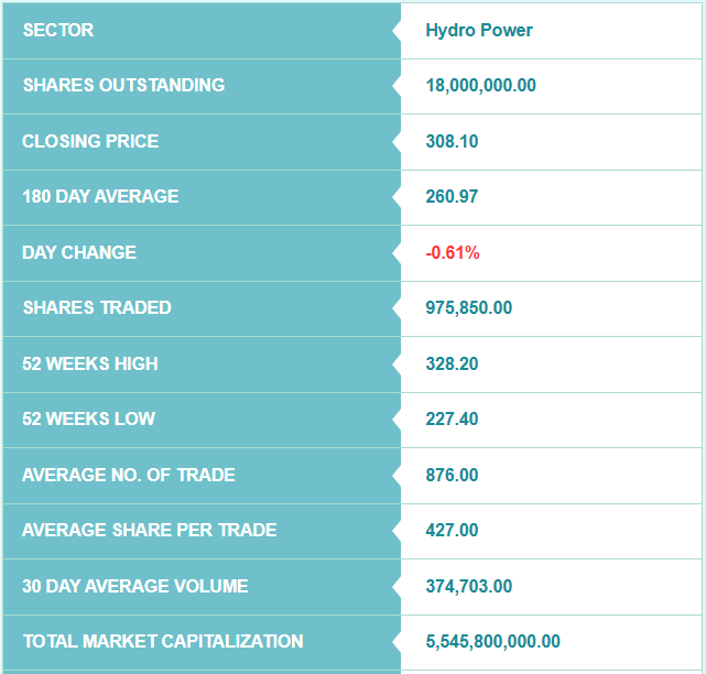 हाल नेप्सेमा कम्पनीको १ करोड ८० लाख कित्ता शेयर सूचीकृत छ। साताको अन्तिम कारोबार मूल्यका आधारमा कम्पनीको कुल बजार पूँजीकरण ५ अर्ब ५४ करोड ५८ लाख रुपैयाँ रहेको छ। कम्पनीको १८० दिने औषत मूल्य २६० रुपैयाँ ९७ पैसा रहेको छ। त्यसैगरी, कम्पनीको ५२ हप्ताको उच्च मूल्य ३२८ रुपैयाँ २० पैसा रहेको छ भने न्यून मूल्य २२७ रुपैयाँ ४० पैसा रहेको छ।