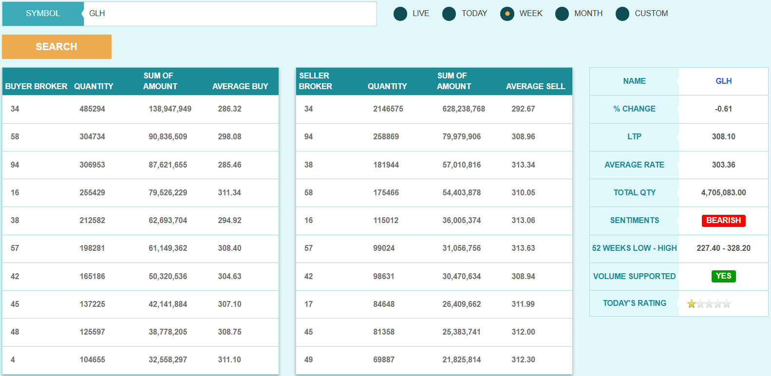 यस साता ब्रोकर नम्बर ३४ ले कम्पनीको सबैभन्दा बढी शेयर खरिदबिक्री गरेको छ। यस साता सो ब्रोकरले कम्पनीको २१ लाख ४६ हजार ५७५ कित्ता शेयर बिक्री गरी ४ लाख ८५ हजार २९४ कित्ता शेयर खरिद गरेको छ। यता ब्रोकर नम्बर ५८ ले यस साता कम्पनीको ३ लाख ४ हजार ७३४ कित्ता शेयर खरिद गरेको छ।