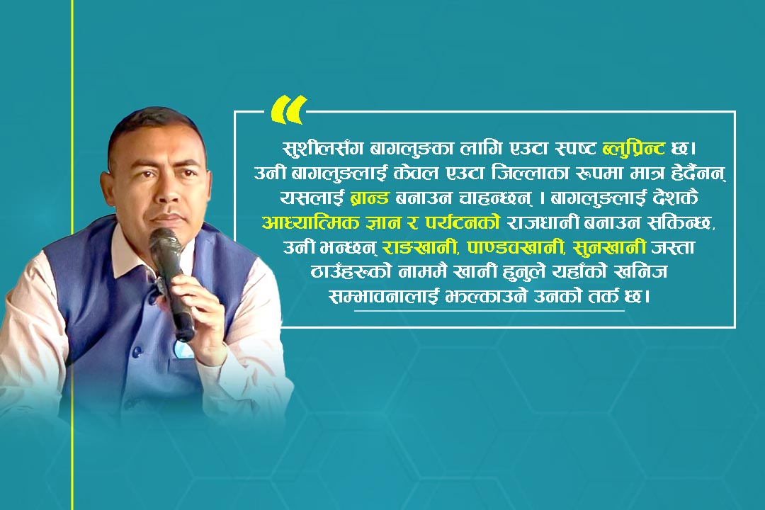 सुशीलसँग बागलुङका लागि एउटा स्पष्ट ‘ब्लुप्रिन्ट’ छ। उनी बागलुङलाई केवल एउटा जिल्लाका रूपमा मात्र हेर्दैनन्, यसलाई ‘ब्रान्ड’ बनाउन चाहन्छन् । ‘बागलुङलाई देशकै आध्यात्मिक ज्ञान र पर्यटनको राजधानी बनाउन सकिन्छ,’ उनी भन्छन्। राङखानी, पाण्डवखानी, सुनखानी जस्ता ठाउँहरूको नाममै ‘खानी’ हुनुले यहाँको खनिज सम्भावनालाई झल्काउने उनको तर्क छ।