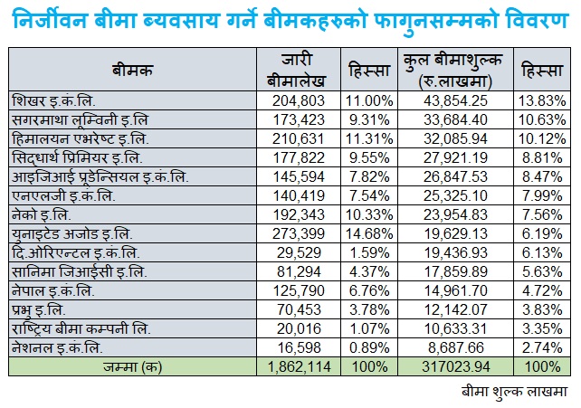 यस्तै, विदेशी लगानी रहेको दि ओरिएन्टल इन्स्योरेन्सले १.५९ प्रतिशत बीमालेख जारी गरे पनि प्रिमियम संकलनमा भने ६.१३ प्रतिशतको बलियो उपस्थिति जनाएको छ। हालसम्म कुल १८ लाख ६२ हजार ११४ वटा बीमालेखहरू जारी भएका छन्। यो तथ्यांकले निर्जीवन बीमा क्षेत्रमा प्रतिस्पर्धात्मक वातावरण र बीमाको दायरा बिस्तारै बढ्दै गएको संकेत गर्दछ।