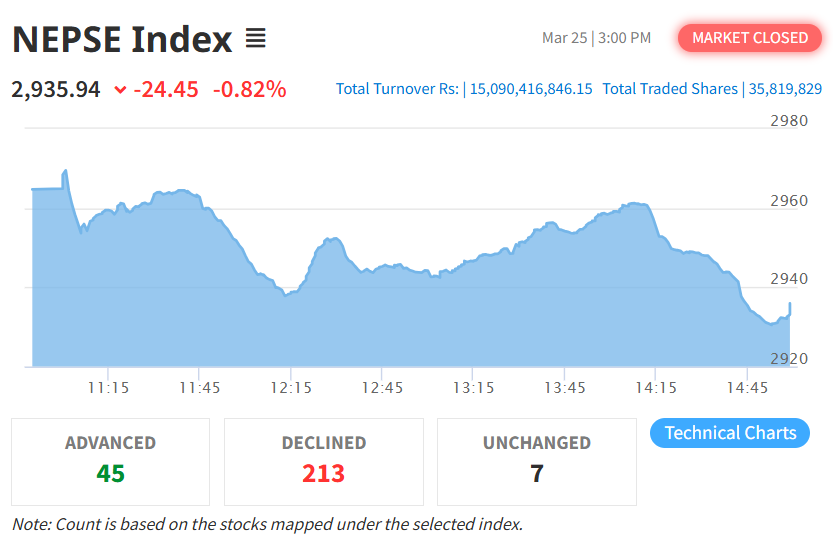 यस दिन नेप्से परिसूचक २४.४५ अंक घटेर २९३५.९४ विन्दुमा झरेको छ। त्यस्तै, यस दिन सेन्सेटिभ इण्डेक्स ६.५४ अंक घटेको छ भने फ्लोट इण्डेक्स २.४६ अंक र सेन्सेटिभ इण्डेक्स २.२६ अंक घटेको छ।