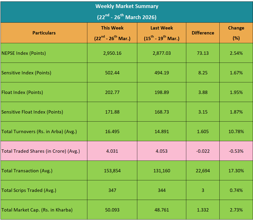 यस साता ५ कारोबार दिनका लागि बजार खुलेको थियो। जसमध्ये ४ कारोबार दिन नेप्से बढेको थियो भने १ कारोबार दिन घटेको थियो।