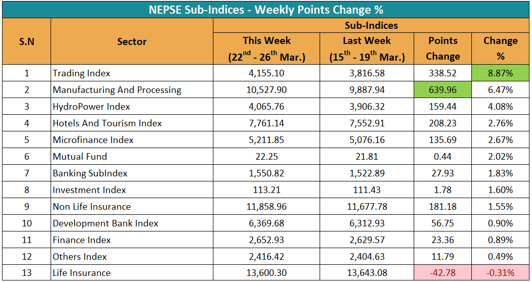 यस साता १३ उपसमूहमध्ये १२ उपसमूहको परिसूचक बढेको छ भने १ उपसमूहको परिसूचक घटेको छ। यस साता व्यापार उपसमूहको परिसूचक सर्वाधिक ८.८७ प्रतिशत बढेको छ। गत साता ३८१६.५८ विन्दुमा बन्द भएको यस उपसमूहको परिसूचक, यस साता ३३८.५२ अंक बढेर ४१५५.१० विन्दुमा पुगेको छ। अंकका आधारमा भने यस साता उत्पादन तथा प्रशोधन उपसमूहको परिसूचक सर्वाधिक बढेको हो। गत साता ९८८७.९४ विन्दुमा बन्द भएको सो उपसमूहको परिसूचक, यस साता ६३९.९६ अंक बढेर १० हजार ५२७.९० विन्दुमा पुगेको छ।