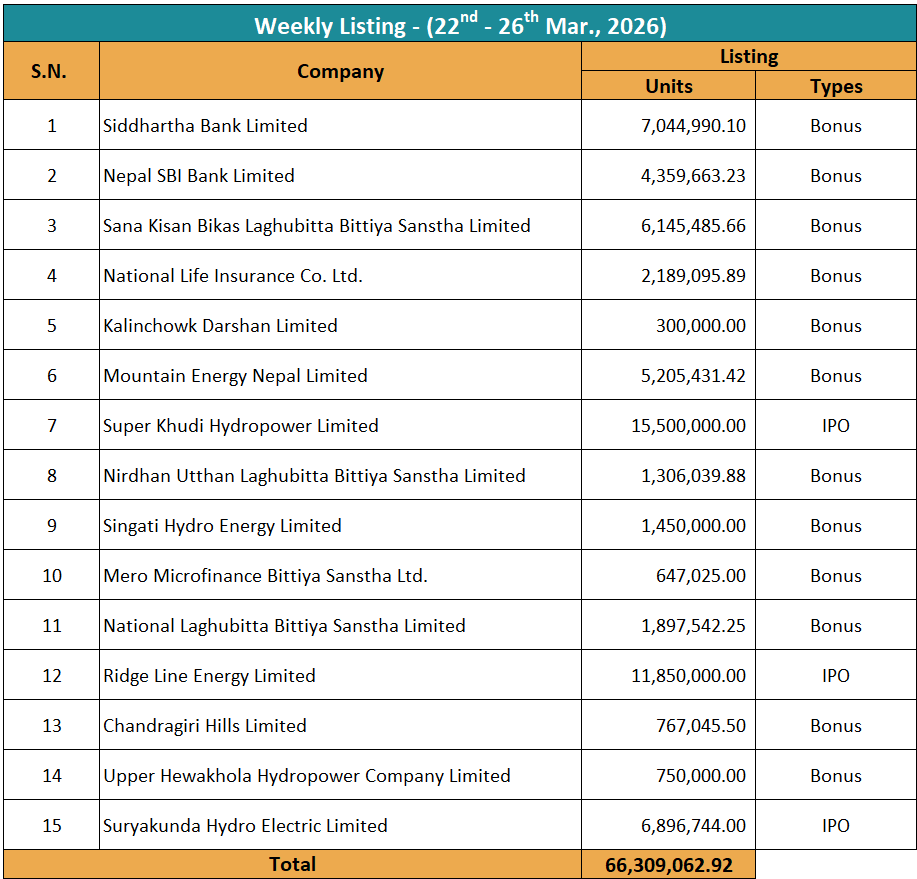 यस साता १५ कम्पनीको ६ करोड ६३ लाख ९ हजार ६२.९२ कित्ता नेप्सेमा सूचीकृत भएको छ। यस साता सिद्धार्थ बैंक, नेपाल एसबिआई बैंक, साना किसान विकास लघुवित्त, नेशनल लाइफ इन्स्योरेन्स, कालिञ्चोक दर्शन, माउन्टेन इनर्जी, निर्धन उत्थान लघुवित्त, सिंगटी हाइड्रो, मेरो माइक्रोफाइनान्स, नेशनल लघुवित्त, चन्द्रागिरी हिल्स र अप्पर हेवाखोला हाइड्रोपावरको बोनस शेयर नेप्सेमा सूचीकृत भएको हो। त्यस्तै, यस साता सुपर खुदी हाइड्रोपावर, रिज लाइन इनर्जी र सूर्यकुण्ड हाइड्रो इलेक्ट्रिकको आईपीओ पनि नेप्सेमा सूचीकृत भएको छ।