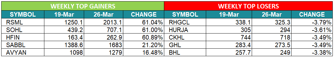 यस साता रिलायन्स स्पिनिङ्ग मिल्सको शेयरमूल्य सर्वाधिक ६१.०४ प्रतिशत बढेको छ। गत साता १ हजार २५० रुपैयाँ १० पैसामा अन्तिम कारोबार भएको सो कम्पनीको शेयर यस साता २ हजार १३ रुपैयाँ १० पैसामा अन्तिम कारोबार भएको छ। त्यस्तै, यस साता सोलु हाइड्रोपावरको शेयरमूल्य ६१ प्रतिशत बढेको छ भने होटल फरेष्ट इनको शेयरमूल्य करिब ६१ प्रतिशत बढेको छ। यस साता मूल्य घटेका स्टकहरुको मूल्य गिरावट दर ४ प्रतिशतभन्दा कम रहेको छ।