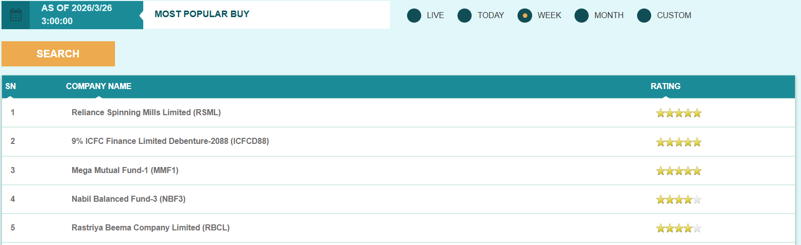 फ्लोरसिट विश्लेषण गर्दा यस साता रिलायन्स स्पिनिङ्ग मिल्स, ९ प्रतिशत आइसिएफसि फाइनान्स लिमिटेड डिबेञ्चर २०८८, मेगा म्युचुअल फण्ड १ लगायतका स्टकहरु मोस्ट पपुलर बाइ स्टक सूचीको शीर्ष स्थानमा रहेका छन् भने सिक्लेस हाइड्रोपावर, एशियन हाइड्रोपावर, कालिका पावर कम्पनी लगायतका स्टकहरु मोस्ट पपुलर सेल स्टक सूचीको शीर्ष स्थानमा रहेका छन्।