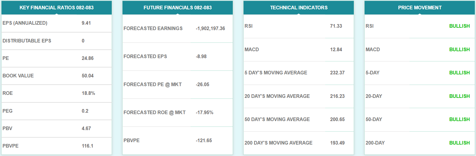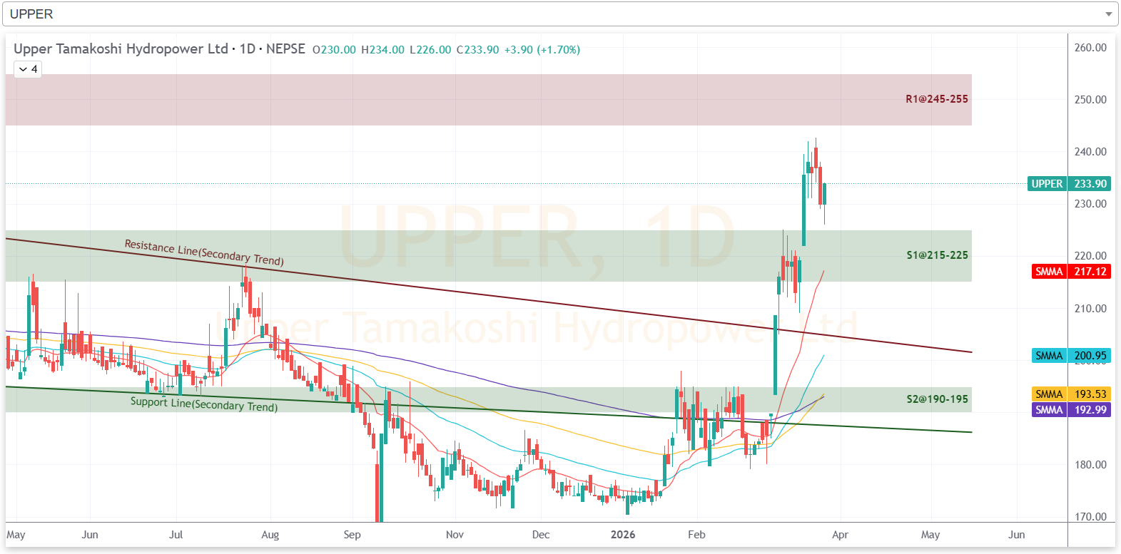 लामो समयदेखि १७० देखि २२० को बीचमा कारोबार भएको कम्पनीको शेयरमूल्यले गत साता ‘ब्रेकआउट’ गरेको थियो। सोपश्चात यस साता भने कम्पनीको शेयरमूल्यमा केही करेक्सन देखिएको छ। ‘ब्रेकआउट’ पछि लगानीकर्ताहरुले नाफा सुरक्षित गर्दा सो करेक्सन देखिएको हो। यद्यपि, साताको अन्तिम कारोबार दिन कम्पनीको शेयरमूल्य बढेर बन्द भएको छ। हाल २२५ भन्दा माथि हुनुले कम्पनीको शेयरमूल्य अझै बुलिश अवस्थामा नै रहेको संकेत गर्दछ। यद्यपि, मूल्य २१५ भन्दा तल झर्यो भने पुनः कमजोर अवस्थामा प्रवेश गर्ने संकेत गर्दछ।