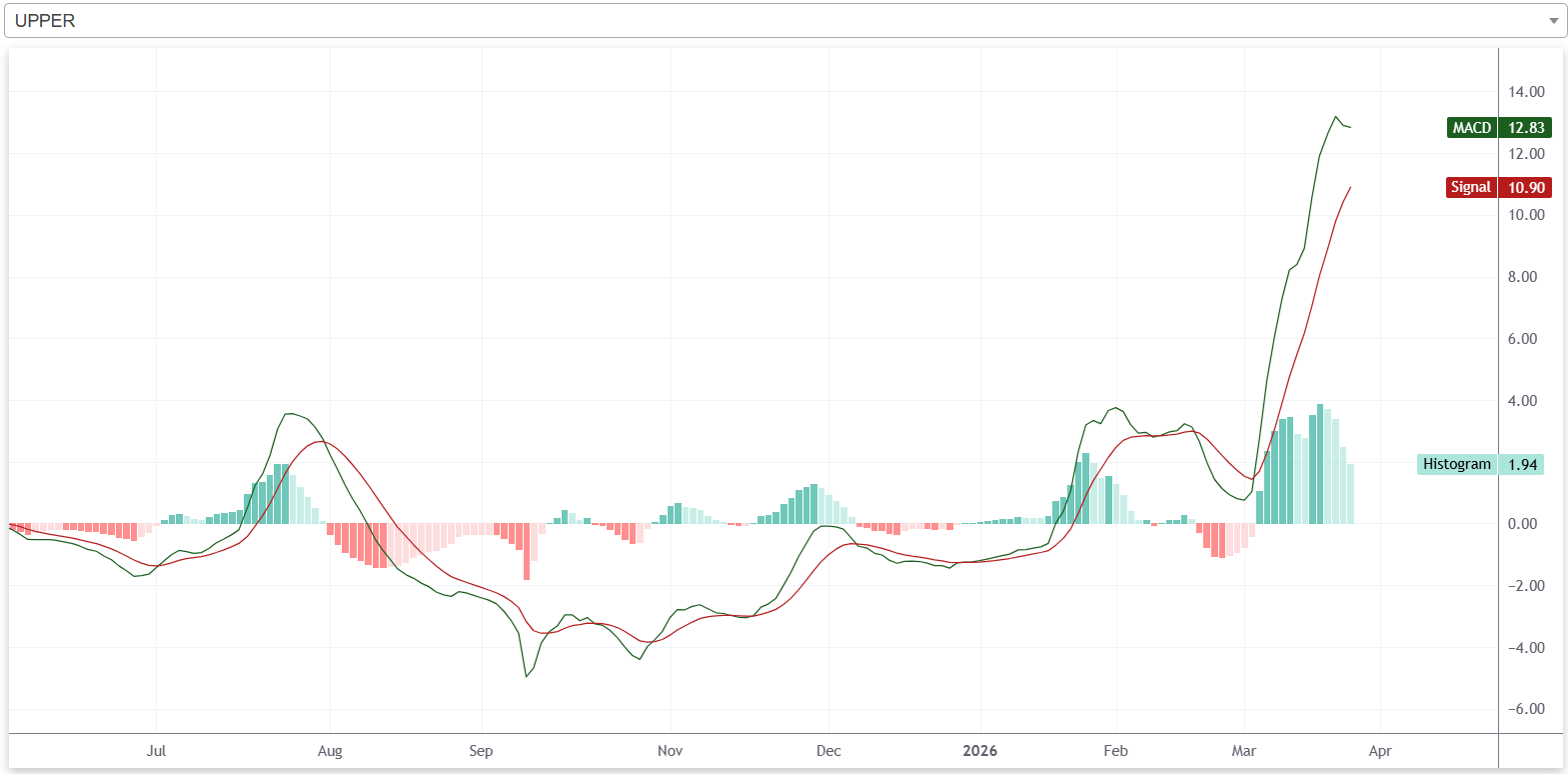 यस साता कम्पनीको शेयरमूल्य बुलिश प्रवृत्तिमा रहेको छ। कम्पनीको एमएसिडी रेखा सिग्नल रेखाभन्दा माथि रहेको छ र यी दुई रेखाबीचको दूरी फराकिलो रहेको छ। त्यसैगरी, कम्पनीको हिस्टोग्राम, एमएसिडी रेखा र सिग्नल रेखा सबै शून्य रेखाभन्दा माथि रहेका छन्। यद्यपि, साताको अन्त्यतिर कम्पनीको शेयरमूल्य घट्दा हिस्टोग्रामको उचाई भने घटेको छ।