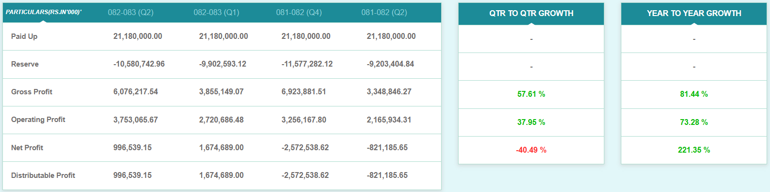 चालु आर्थिक वर्षको पहिलो ६ महिनासम्ममा कम्पनीले ९९ करोड ६५ लाख ३९ हजार रुपैयाँ खुद नाफा कमाएको छ। गत आर्थिक वर्षको सोही अवधिसम्ममा कम्पनीको यस्तो मुनाफा ८२ करोड ११ लाख ८५ हजार रुपैयाँ ऋणात्मक थियो।