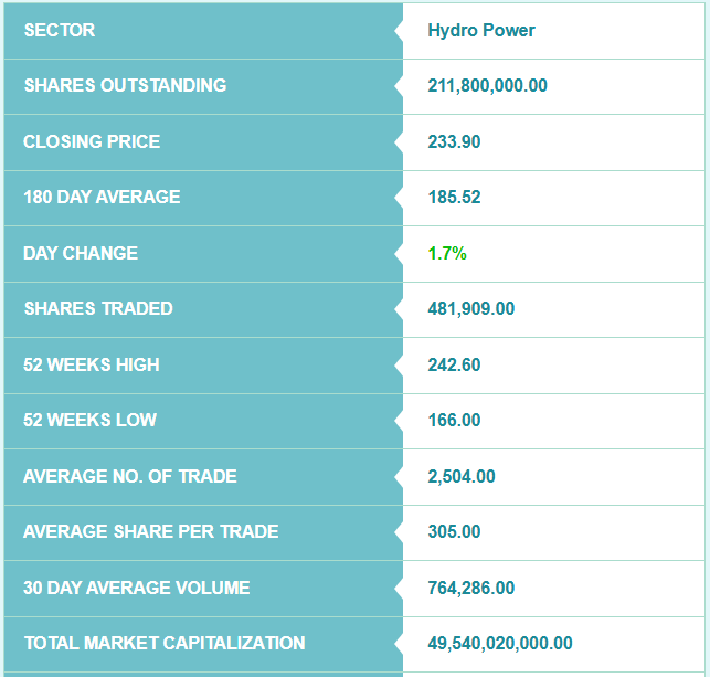 हाल नेप्सेमा कम्पनीको २१ करोड १८ लाख कित्ता शेयर सूचीकृत छ। साताको अन्तिम कारोबार मूल्यका आधारमा कम्पनीको कुल बजार पूँजीकरण ४९ अर्ब ५४ करोड २० हजार रुपैयाँ रहेको छ। कम्पनीको १८० दिने औषत मूल्य १८५ रुपैयाँ ५२ पैसा रहेको छ। त्यसैगरी, कम्पनीको ५२ हप्ताको उच्च मूल्य २४२ रुपैयाँ ६० पैसा रहेको छ भने न्यून मूल्य १६६ रुपैयाँ रहेको छ।