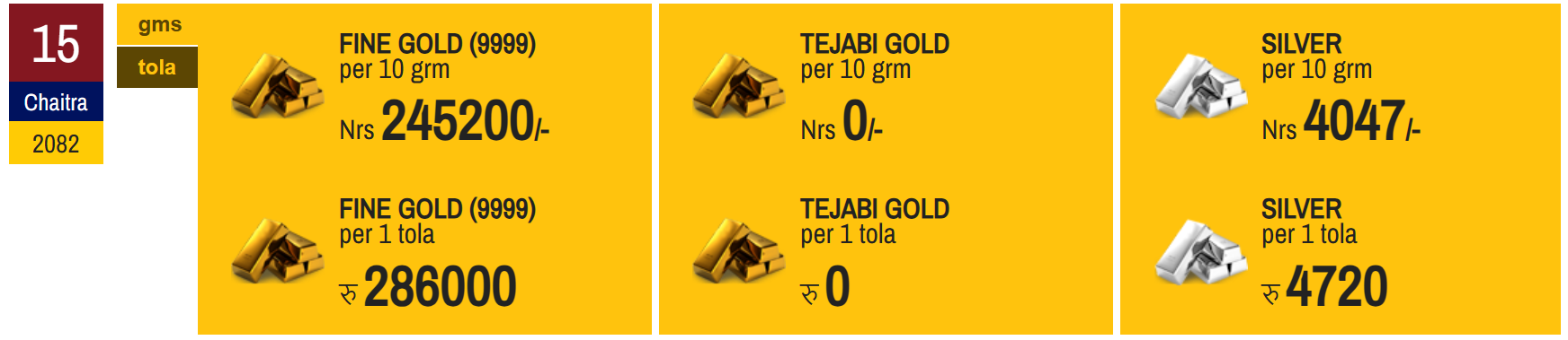 त्यस्तै, यसदिन बजारमा चाँदी प्रतितोला ४ हजार ७२० रुपैयाँमा खरिदबिक्री भइरहेको छ । गत शुक्रबारको बजारमा चाँदी प्रतितोला ४ हजार ६७० रुपैयाँमा खरिदबिक्री भएको थियो ।