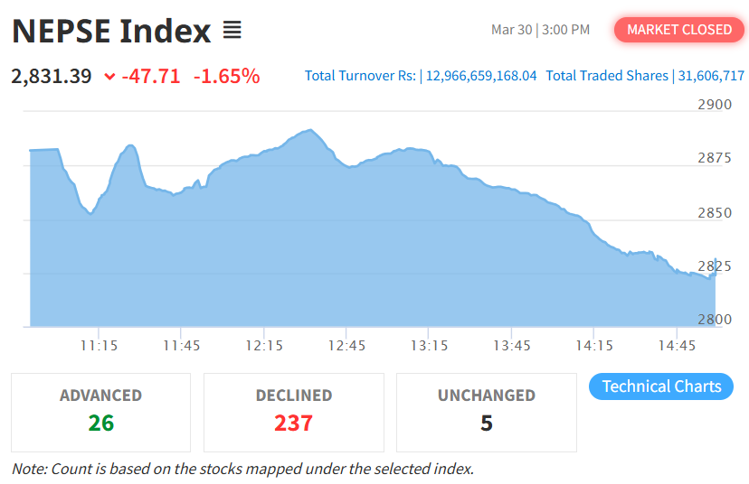 सोमबार नेप्से परिसूचक ४७.७१ अंक घटेर २८३१.३९ विन्दुमा झरेको छ। त्यस्तै, यस दिन सेन्सेटिभ इण्डेक्स ७.९० अंक घटेको छ भने फ्लोट इण्डेक्स ३.२० अंक र सेन्सेटिभ फ्लोट इण्डेक्स २.५५ अंक घटेको छ।