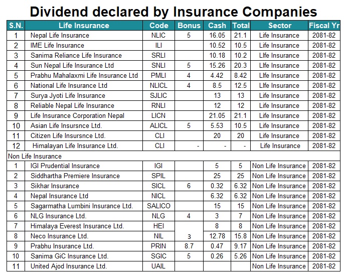 यता निर्जीवन बिमातर्फ सिद्धार्थ प्रिमियर इन्स्योरेन्सले सबैभन्दा बढी २५ प्रतिशत नगद लाभांश घोषणा गरेर लगानीकर्तालाई आकर्षित गरेको छ। नेको इन्स्योरेन्सले ३ प्रतिशत बोनस र १२.७८ प्रतिशत नगदसहित कुल १५.८ प्रतिशत लाभांश दिएको छ । यता सगरमाथा लुम्बिनीले १५ प्रतिशत नगद लाभांश र प्रभु इन्स्योरेन्सले ८.७ प्रतिशत बोनस र ०.४७ प्रतिशत नगद गरी कुल ९.१७ प्रतिशत लाभांश दिने भएका छन्। हिमालय एभरेष्ट र शिखर इन्स्योरेन्सले पनि क्रमशः ८ र ६.३२ प्रतिशत लाभांशको घोषणा गरेका छन्। निर्जीवन बीमा कम्पनीतर्फ शिखर, एनएलजी, नेको, प्रभु र सानिमा जीआईसीले मात्रै बोनस शेयर दिएका छन् । अधिकांश कम्पनीहरूले पुँजी वृद्धिका लागि बोनस शेयर र तत्काल प्रतिफलका लागि नगद लाभांशको सन्तुलन मिलाएको देखिन्छ। निर्जीवन बीमा कम्पनीतर्फ अहिलेसम्म युनाइटेड अजोड इन्स्योरेन्सले गत वर्षको साधारण सभा अहिलेसम्म गरेको छैन । त्यसैगरी सरकारी स्वामित्वमा सञ्चालनमा रहेको राष्ट्रिय बीमा कम्पनी लिमिटेडले पनि साधारण सभा गरेको छैन । युनाइटेड अजोड इन्स्योरेन्सले भने चैत्र २६ गतेदेखि चुक्ता पुँजीको १० प्रतिशत हकप्रद निष्काशन गर्दैछ ।