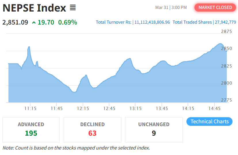 यस दिन नेप्से परिसूचक १९.७० अंक बढेर २८५१.०९ विन्दुमा पुगेको छ। त्यस्तै, यस दिन सेन्सेटिभ इण्डेक्स ३.२६ अंक बढेको छ भने फ्लोट इण्डेक्स १.२४ अंक र सेन्सेटिभ फ्लोट इण्डेक्स १.०२ अंक बढेको छ।