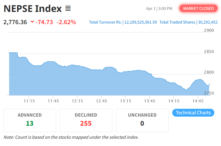 यस दिन नेप्से परिसूचक ७४.७३ अंक घटेर २७७६.३६ विन्दुमा झरेको छ। त्यस्तै, यस दिन सेन्सेटिभ इण्डेक्स ११.२१ अंक घटेको छ भने फ्लोट इण्डेक्स ५.१३ अंक र सेन्सेटिभ फ्लोट इण्डेक्स ४.०२ अंक घटेको छ।