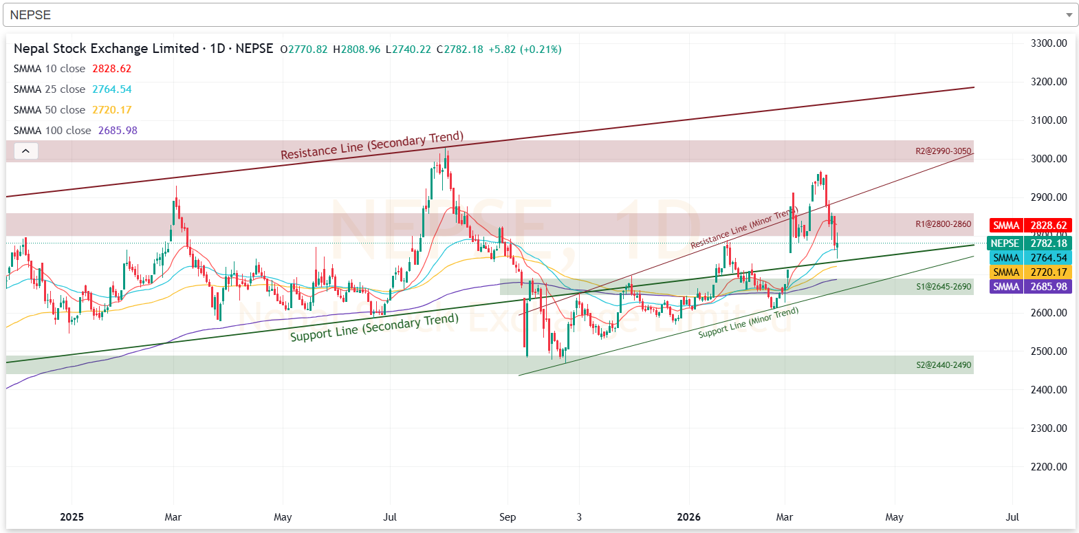 गत साता नेप्से परिसूचक घटेर सो साताको टेवा क्षेत्र अर्थात २८०० देखि २८६० को क्षेत्रभन्दा तल बन्द भएको छ। यस अनुसार, हाल सो क्षेत्र नेप्सेको लागि प्रतिरोध क्षेत्र बनेको छ। आगामी दिनमा नेप्सेले पुनः ओरालो यात्रालाई निरन्तरता दिएमा २६४५ देखि २६९० को क्षेत्रमा टेवा पाउने देखिन्छ।