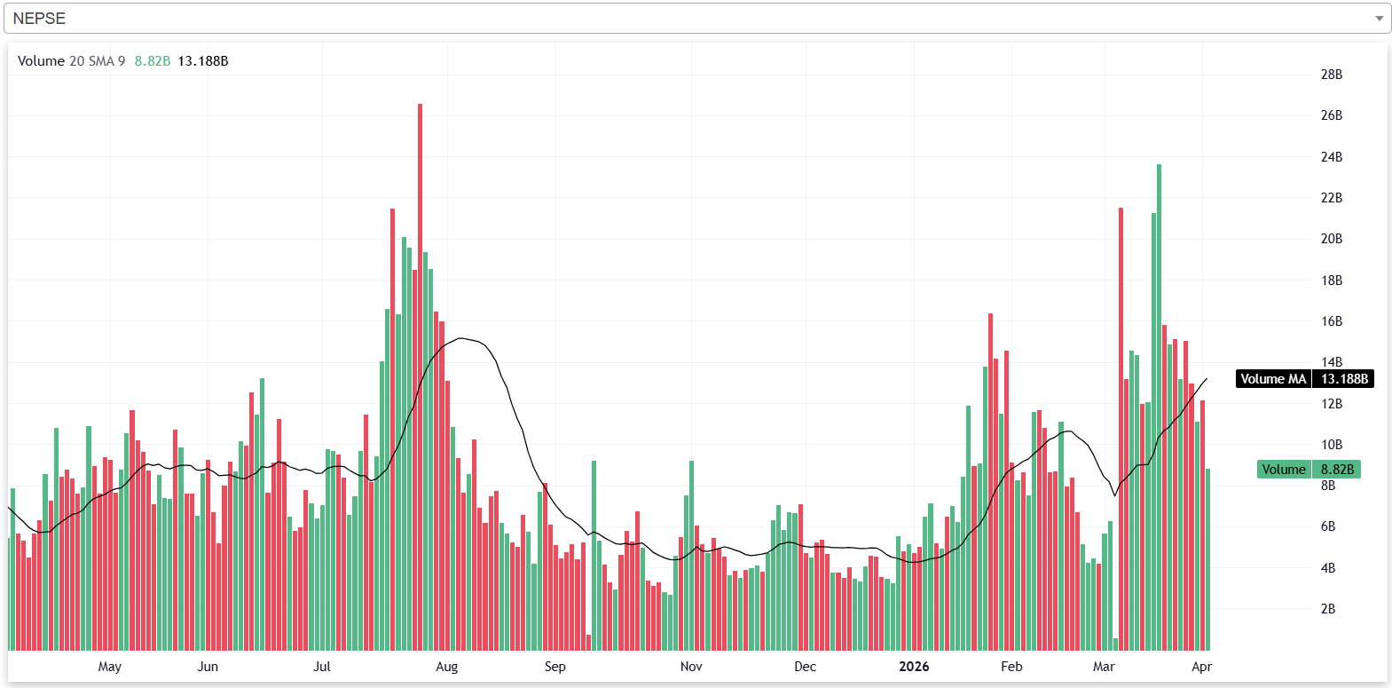 गत साता नेप्सेको भोल्यूम कमजोर भएको छ। नेप्से घट्दो क्रममा रहेको बेला भोल्यूम पनि घट्नु राम्रो मानिन्छ। दैनिक र साप्ताहिक रुपमा पनि देखिएको औषतभन्दा कम भोल्यूमले अहिले लगानीकर्ताहरु सस्तोमा शेयर बिक्री गर्न नहतारिएको संकेत गर्दछ।