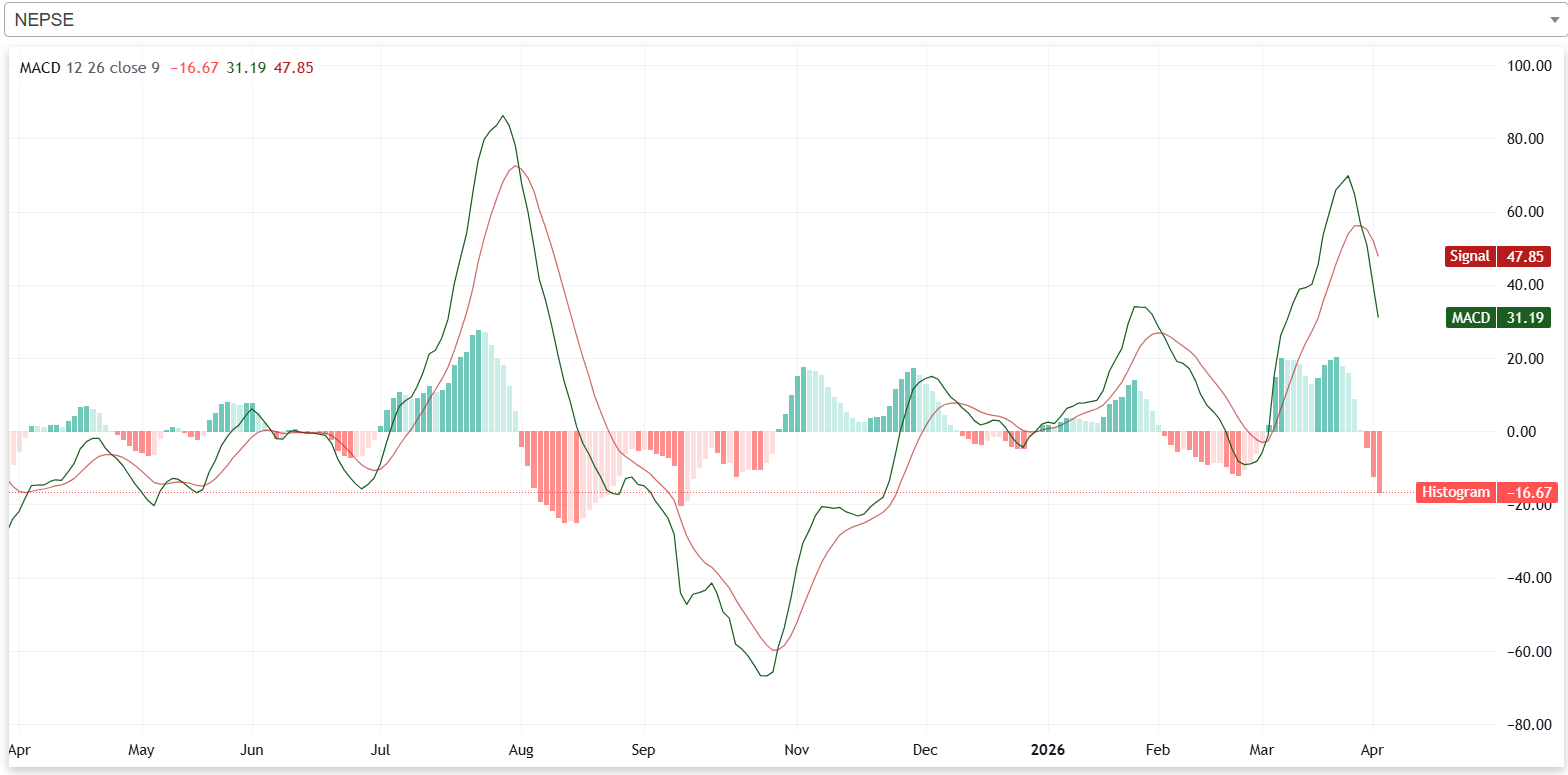 गत साताको दोस्रो कारोबार दिन नेप्सेले बियरिश क्रशओभर बनाएको थियो। एमएसिडी रेखाले सिग्नल रेखालाई माथिबाट काटेर तल लागेसँगै यस्तो क्रशओभर बनेको थियो। बियरिश क्रशओभर बजार घट्ने संकेत हो। नेप्सेको हिस्टोग्राम पनि नकारात्मक क्षेत्रमा झरेको छ।