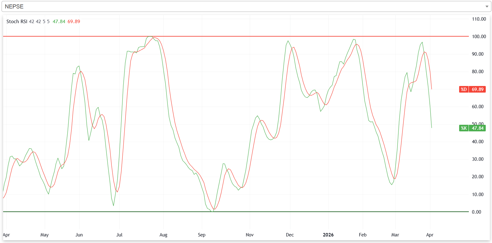 गत साता नेप्सेको स्टकास्टिक आरएसआई न्यूट्रल जोनमा रहेको छ। यसले बजारमा शेयर खरिदबिक्री चाप सन्तुलनमा रहेको संकेत गर्दछ।