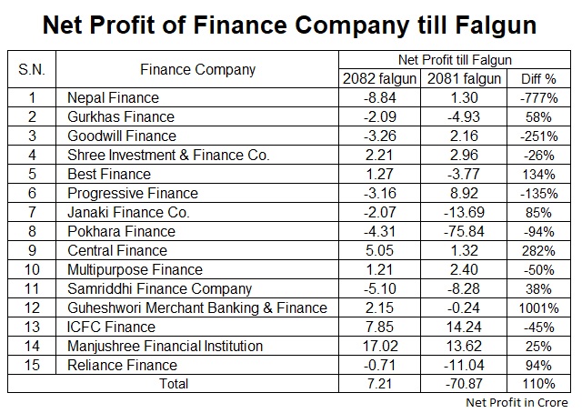 अघिल्लो वर्षको फागुन मसान्तसम्म ७० करोड ८७ लाख रुपैयाँ ऋणात्मक (नोक्सान) मा रहेको वित्त क्षेत्र यो वर्ष सुधारिँदै ७ करोड २१ लाख रुपैयाँ धनात्मक (नाफा) मा आएको छ। यो अघिल्लो वर्षको तुलनामा ११० प्रतिशतको वृद्धि हो।