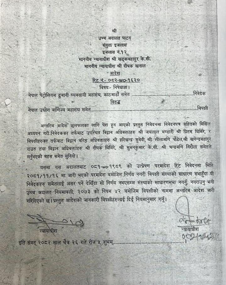 उच्च अदालत पाटनले नेपाल उद्योग वाणिज्य महासंघ (एफएनसीसीआई) को साधारण सभा तत्काल नगर्न अन्तरिम आदेश जारी गरेको छ। यो सँगै महासंघको निर्वाचन रोकिएको छ । न्यायाधीशद्वय खड्गबहादुर के.सी. र दीपक खनालको संयुक्त इजलासले नेपाल पेट्रोलियम ढुवानी व्यवसायी महासंघले दायर गरेको रिटमाथि सुनुवाइ गर्दै यस्तो आदेश दिएको हो।