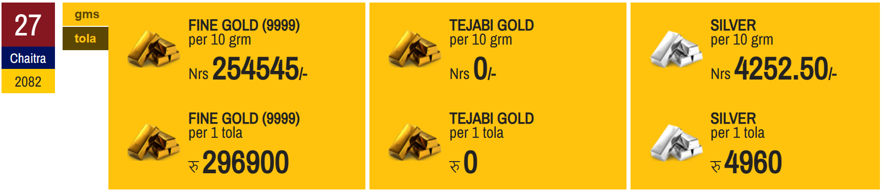 त्यस्तै, यस दिन बजारमा चाँदी प्रतितोला चार हजार ९६० रुपैयाँमा खरिदबिक्री भइरहेको छ। बिहीबारको बजारमा चाँदी प्रतितोला चार हजार ८७५ रुपैयाँमा खरिदबिक्री भएको थियो ।