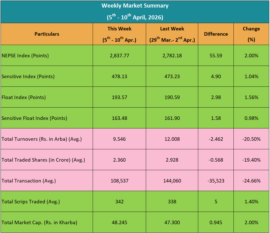 यस साता ६ कारोबार दिनका लागि बजार खुलेको थियो। जसमध्ये ३ कारोबार दिन नेप्से बढेको थियो भने ३ कारोबार दिन घटेको थियो।