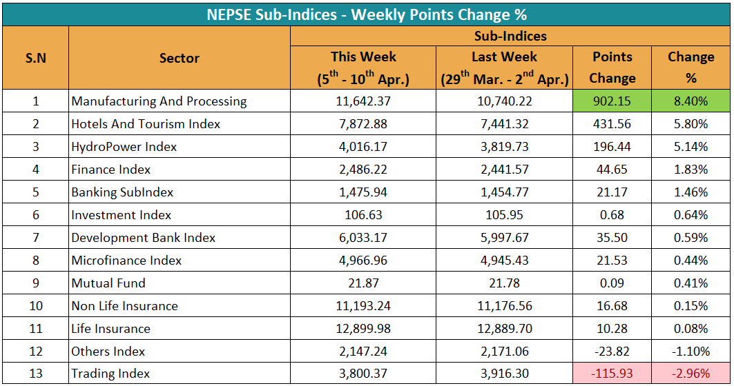 यस साता १३ उपसमूहमध्ये ११ उपसमूहको परिसूचक बढेको छ भने २ उपसमूहको परिसूचक घटेको छ। यस साता उत्पादन तथा प्रशोधन उपसमूहको परिसूचक ८.४० प्रतिशत बढेको छ। गत साता १० हजार ७४०.२२ विन्दुमा बन्द भएको यस उपसमूहको परिसूचक, यस साता ९०२.१५ अंक बढेर ११ हजार ६४२.३७ विन्दुमा पुगेको छ। अंकका आधारमा पनि यस साता सोही उपसमूहको परिसूचक सर्वाधिक बढेको हो।