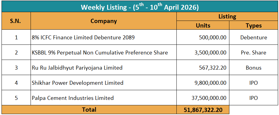 यस साता ५ कम्पनीको ५ करोड १८ लाख ६७ हजार ३२२.२० कित्ता नेप्सेमा सूचीकृत भएको छ। यस साता ८ प्रतिशत आइसिएफसि फाइनान्स लिमिटेड डिबेञ्चर २०८९ र केएसबिबिएल ९ प्रतिशत अविमोच्य असञ्चिति अग्राधिकार शेयर नेप्सेमा सूचीकृत भएको हो भने रु रु जलविद्युत परियोजनाको बोनस शेयर र शिखर पावर डेभलपमेन्ट तथा पाल्पा सिमेन्ट इण्डष्ट्रीजको आईपीओ नेप्सेमा सूचीकृत भएको हो।