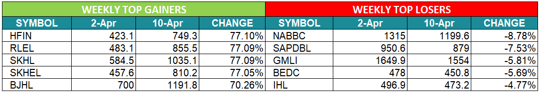 यस साता होटल फरेष्ट इनको शेयरमूल्य सर्वाधिक ७७.१० प्रतिशत बढेको छ। गत साता ४२३ रुपैयाँ १० पैसामा अन्तिम कारोबार भएको सो कम्पनीको शेयर यस साता ७४९ रुपैयाँ ३० पैसामा अन्तिम कारोबार भएको छ। त्यस्तै, यस साता रिज लाइन इनर्जी र सुपर खुदी हाइड्रोपावरको शेयरमूल्य ७७.०९ प्रतिशत बढेको छ भने सूर्यकुण्ड हाइड्रो इलेक्ट्रिकको शेयरमूल्य ७७.०५ प्रतिशत बढेको छ। यस साता नारायणी डेभलपमेन्ट बैंकको शेयरमूल्य सर्वाधिक ८.७८ प्रतिशत घटेको छ भने सप्तकोशी डेभलपमेन्ट बैंकको शेयरमूल्य साढे ७ प्रतिशत घटेको छ।