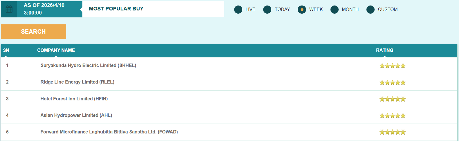 फ्लोरसिट विश्लेषण गर्दा यस साता सूर्यकुण्ड हाइड्रो इलेक्ट्रिक, रिज लाइन इनर्जी, होटल फरेष्ट इन लगायतका स्टकहरु मोस्ट पपुलर बाइ स्टक सूचीको शीर्ष स्थानमा रहेका छन् भने श्वेत गंगा हाइड्रोपावर एण्ड कन्स्ट्रक्सन, उपकार लघुवित्त वित्तीय संस्था, लक्ष्मी उन्नती कोष लगायतका स्टकहरु मोस्ट पपुलर सेल स्टक सूचीको शीर्ष स्थानमा रहेका छन्।