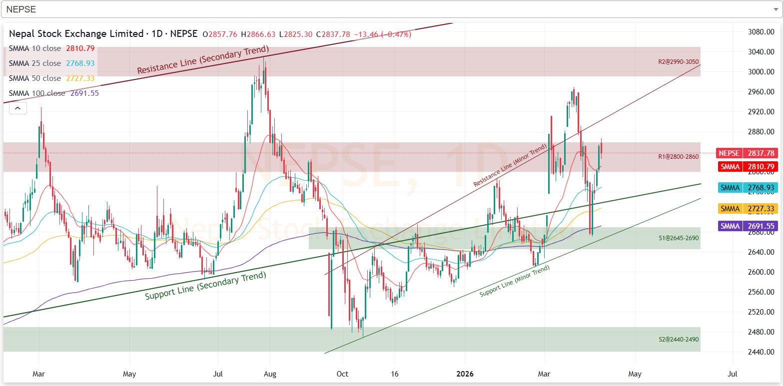 गत साता नेप्से परिसूचक २८०० देखि २८६० को प्रतिरोध परीक्षणमा रहेको छ। साताको अन्तिम कारोबार दिन, इन्ट्रा डे मा नेप्सेले सो क्षेत्र तोडेपनि अन्तिम समयमा भने सोही क्षेत्रमा झरेको छ। आगामी दिनमा नेप्सेले सो क्षेत्र तोडेर उकालो लागेमा २९९० देखि ३०५० को क्षेत्रमा प्रतिरोधको सामना गर्ने देखिन्छ। तर, सो क्षेत्रमा प्रतिरोधको सामना गरी ओरालो लागेमा भने २६४५ देखि २६९० को क्षेत्रमा प्रतिरोधको सामना गर्ने देखिन्छ।