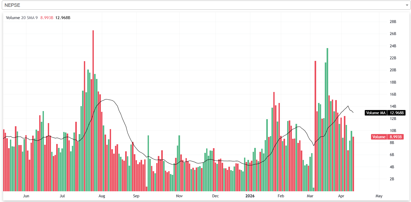 गत साता नेप्सेको भोल्यूम कमजोर रहेको छ। गत साता नेप्सेमा दैनिक औषतमा ९ अर्ब ५४ करोड रुपैयाँबराबरको शेयर खरिदबिक्री भएको छ। साताको अन्तिम कारोबार दिन नेप्सेको २० दिने औषत भोल्यूम १२ अर्ब ९६ करोड रुपैयाँ रहेको छ। २० दिने औषत भोल्यूमको तुलनामा गत साताको दैनिक औषत भोल्यूम २६.३८ प्रतिशत कम हो।
