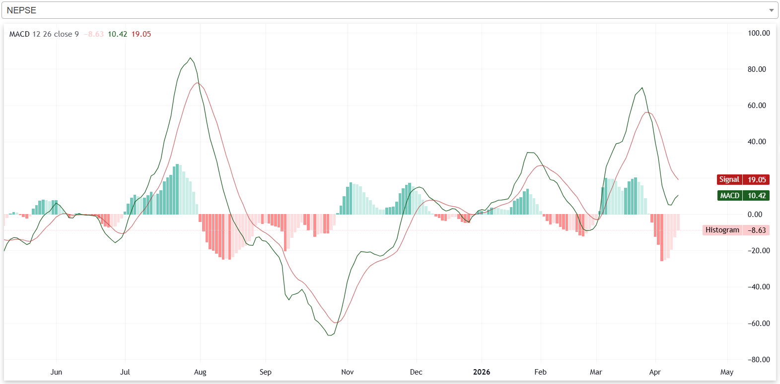 गत साता नेप्सेको एमएसिडी रेखा, सिग्नल रेखाभन्दा तल रहेको छ। त्यस्तै, नेप्सेको हिस्टोग्राम पनि नकारात्मक क्षेत्रमा रहेको छ। यसले गत साता नेप्से बियरिश प्रवृत्तिमा रहेको संकेत गर्दछ। यद्यपि, साताको अन्त्यतिर भने एमएसिडी रेखा र सिग्नल रेखाबीचको दूरी घटेको छ भने हिस्टोग्रामको उचाई पनि घटेको छ। आगामी दिनमा एमएसिडी रेखाले सिग्नल रेखालाई तलबाट काटेर माथि लागेमा बुलिश क्रशओभर बन्नेछ जसले बजार बढ्ने संकेत गर्नेछ।