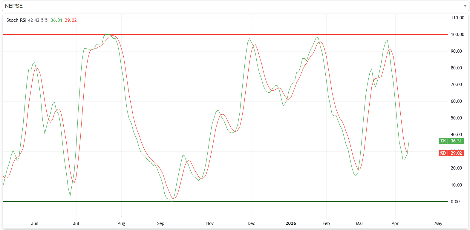 गत साता नेप्सेको स्टकास्टिक आरएसआई न्यूट्रल जोनमा रहेको छ। यसले बजारमा शेयर खरिदबिक्री चाप सन्तुलनमा रहेको संकेत गर्दछ।