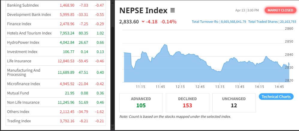 सोमबार नेप्से परिसूचक ४.१८ अंक घटेर २८३३.६० विन्दुमा झरेको छ। त्यस्तै, यस दिन सेन्सेटिभ इण्डेक्स १.४९ अंक घटेको छ भने फ्लोट इण्डेक्स ०.३९ र सेन्सेटिभ इण्डेक्स ०.४१ अंक घटेको छ।