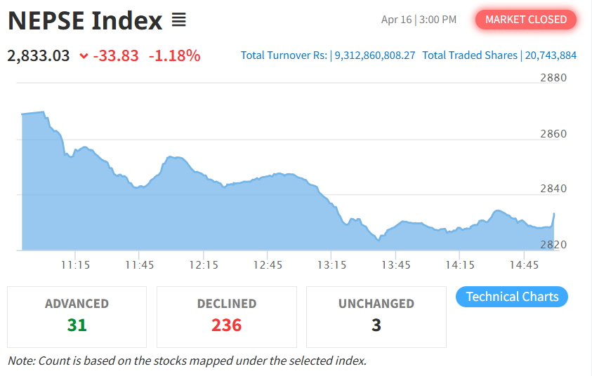 यस दिन नेप्से परिसूचक ३३.८३ अंक घटेर २८३३.०३ विन्दुमा झरेको छ। त्यस्तै, यस दिन सेन्सेटिभ इण्डेक्स ४.४१ अंक घटेको छ भने फ्लोट इण्डेक्स २.२८ अंक र सेन्सेटिभ फ्लोट इण्डेक्स १.५६ अंक घटेको छ।