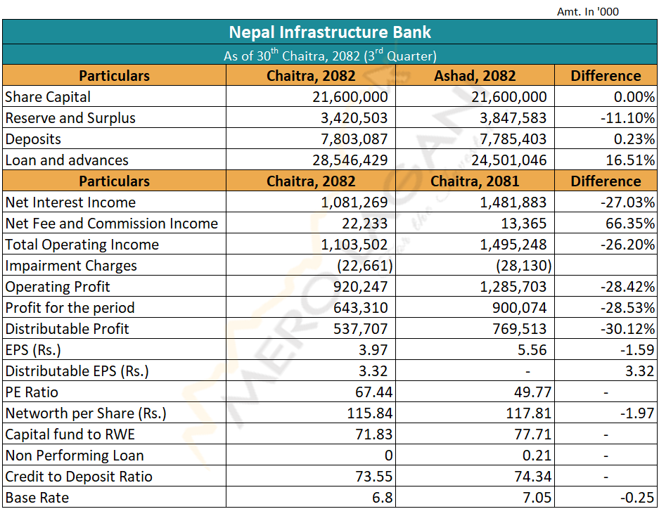 समीक्षा अवधिमा बैंकको खुद ब्याज आम्दानी २७.०३ प्रतिशत घटेको छ भने खुद फि तथा कमिशन आम्दानी ६६.३५ प्रतिशत बढेको छ। त्यस्तै, बैंकको कुल सञ्चालन आम्दानी समीक्षा अवधिमा २६.२० प्रतिशत र सञ्चालन मुनाफा २८.४२ प्रतिशत घटेको छ। समीक्षा अवधिमा बैंकको वितरणयोग्य मुनाफा ३०.१२ प्रतिशत घटेर ५३ करोड ७७ लाख रुपैयाँमा झरेको छ।