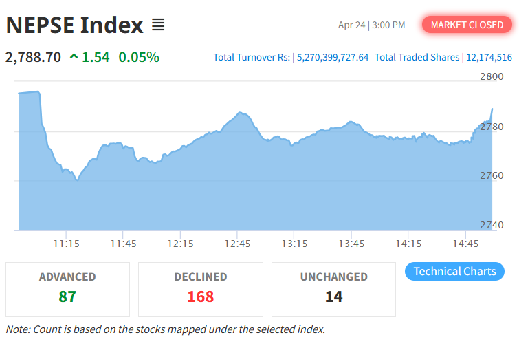 शुक्रबार नेप्से परिसूचक १.५४ अंक बढेर २७८८.७० विन्दुमा पुगेको छ। त्यस्तै, यस दिन फ्लोट इण्डेक्स ०.०६ अंक बढेको छ भने सेन्सेटिभ इण्डेक्स अंक ०.२० अंक र सेन्सेटिभ फ्लोट इण्डेक्स ०.०३ अंक घटेको छ।