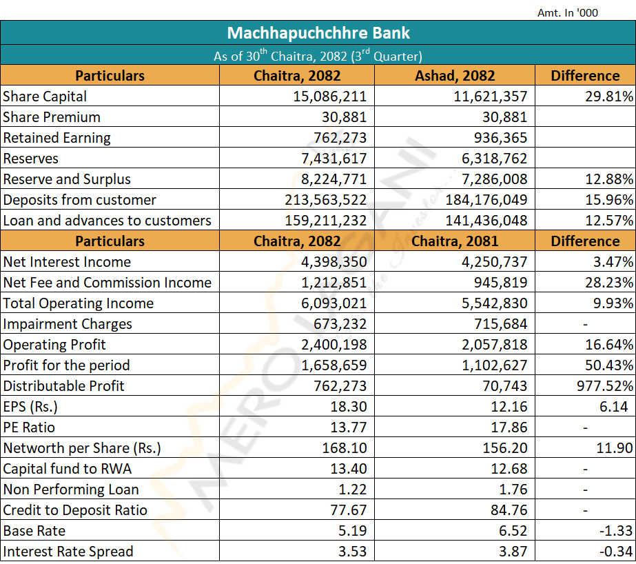 ३ अर्ब बराबरको अविमोच्य असञ्चिति अग्राधिकार शेयर जारी गरी १५ अर्ब ८ करोड रुपैयाँ चुक्ता पूँजी पुर्याएको यस बैंकको जगेडा कोषमा ८ अर्ब २२ करोड रुपैयाँ सञ्चित छ। बैंकले चैत मसान्तसम्ममा २ खर्ब १३ अर्ब रुपैयाँ निक्षेप संकलन गरी १ खर्ब ५९ अर्ब रुपैयाँ कर्जा प्रवाह गरेको छ।