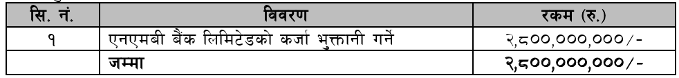 आईपीओ निष्काशनबाट प्राप्त हुने पूँजी रकमलाई बैंकबाट लिईएको कर्जा रकमको भुक्तानी गर्नमा प्रयोग गरिनेछ। अर्थात कम्पनीले २८ करोड रुपैयाँ एनएमबि बैंकलाई भुक्तानी गर्नेछ।