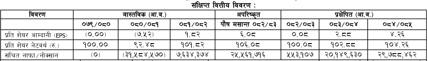 चालु आर्थिक वर्षको अन्त्यसम्ममा कम्पनीले ५ लाख ५३ हजार रुपैयाँ सञ्चित मुनाफा कमाउने प्रक्षेपण गरेको छ। सो अवधिसम्ममा कम्पनीको प्रतिशेयर आम्दानी ८ पैसा र प्रतिशेयर नेटवर्थ १०० रुपैयाँ ८ पैसा पुग्ने प्रक्षेपण गरिएको छ।